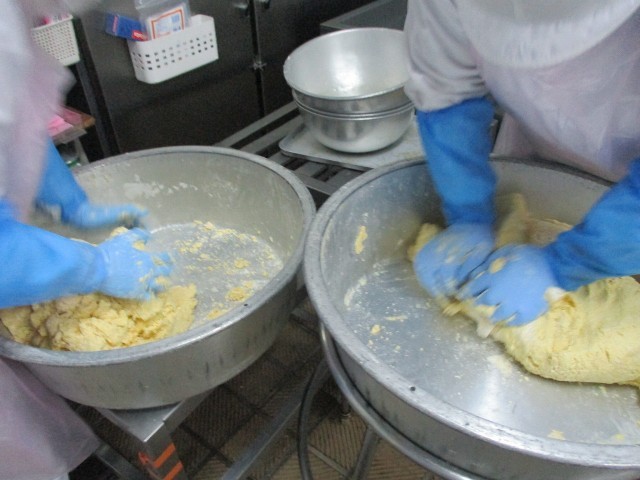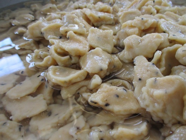 かぼちゃのすいとんでは、すいとんを生地から作りました。かぼちゃ、黒ゴマが練りこまれています。