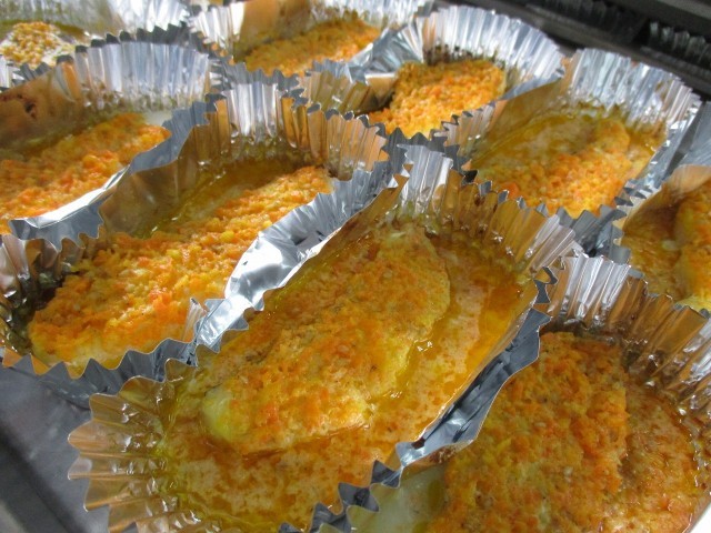 夕焼小焼やきは、すりおろした人参、マヨネーズ、ごまを使ったソースを魚にかけて焼いています。