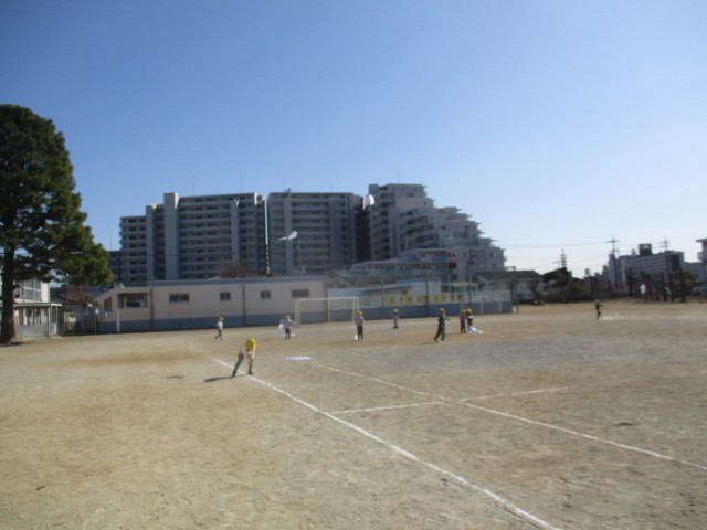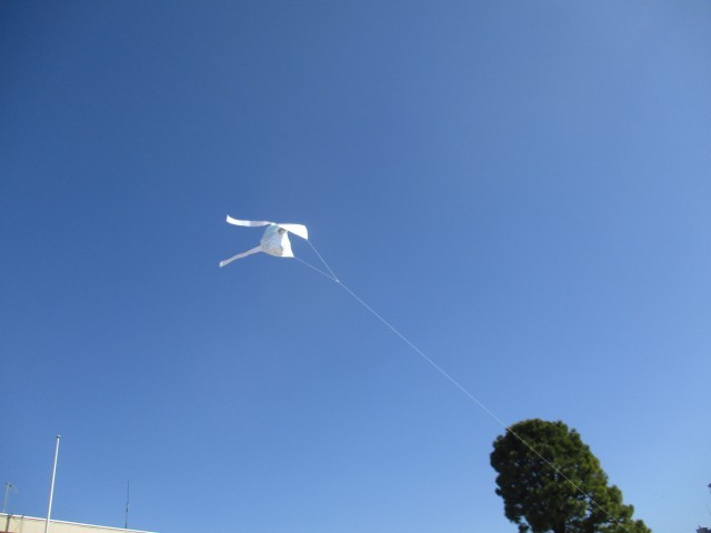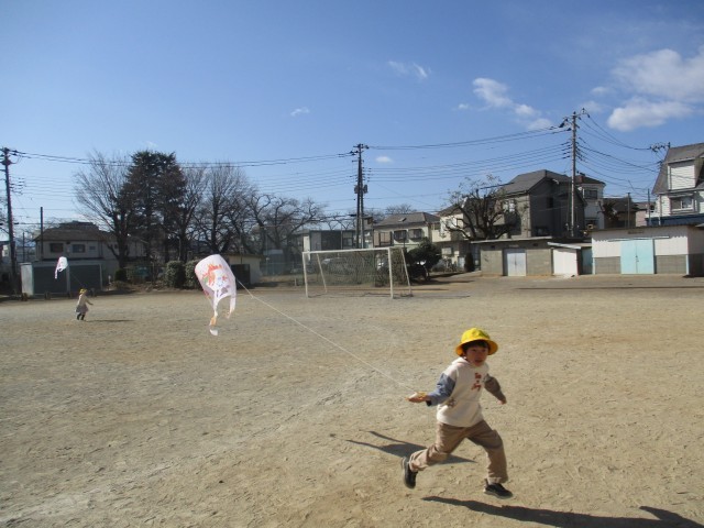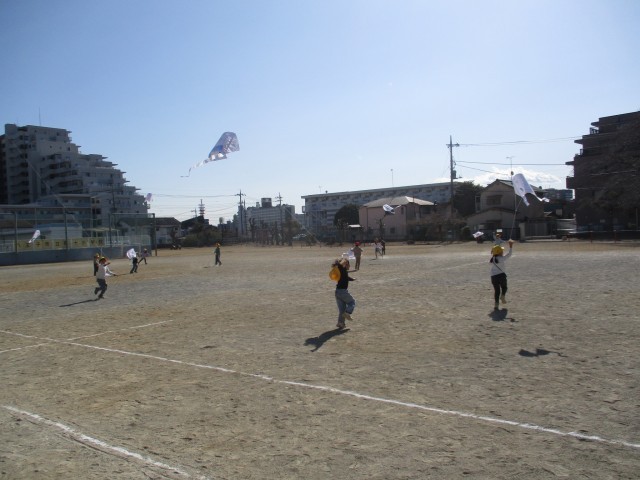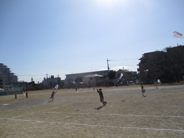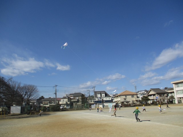 何だろうと校庭をのぞくと、1年生がたこ揚げをしています。