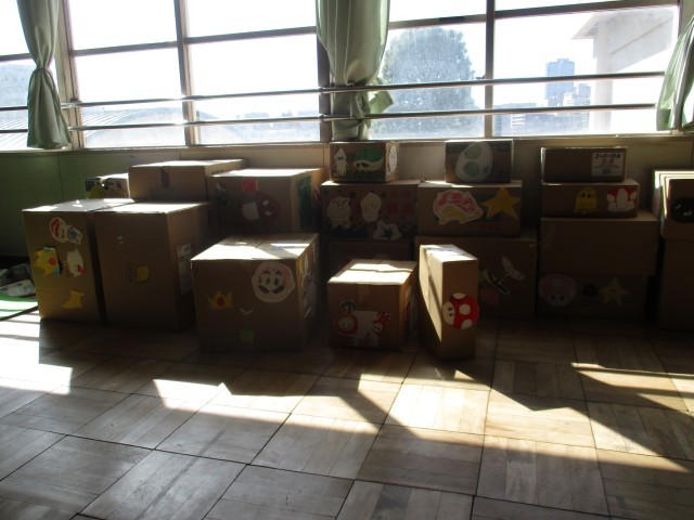 空き教室に絵が貼られた段ボールがありました。