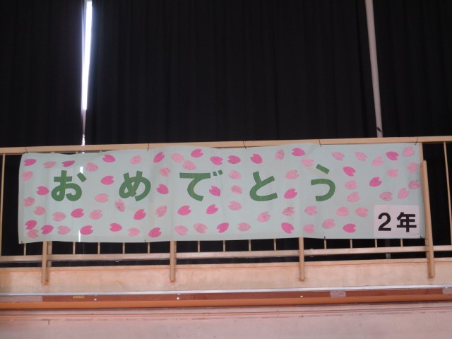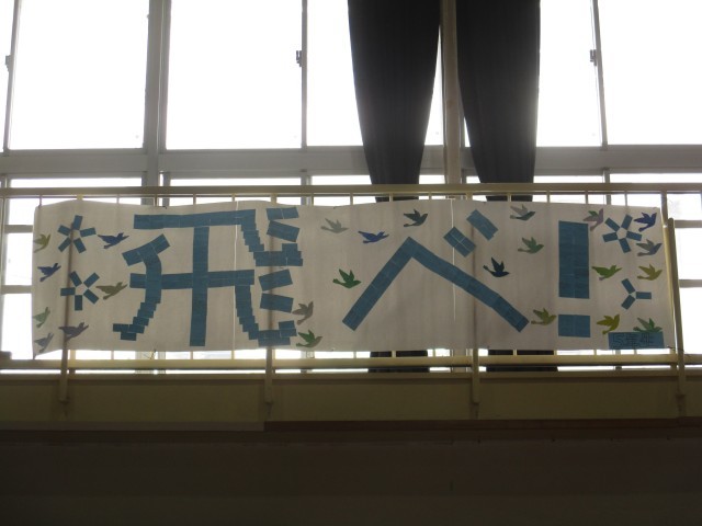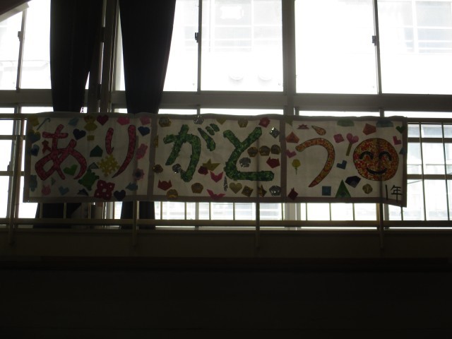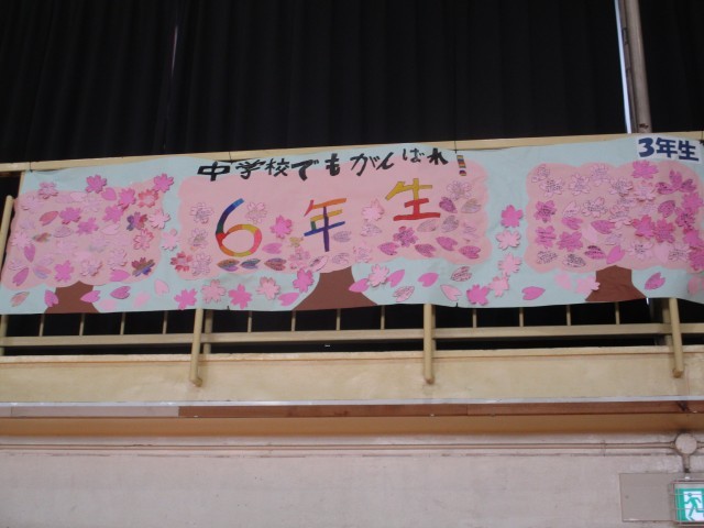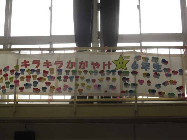 体育館には、在校生が6年生の卒業のお祝いと感謝の言葉を掲示しました。