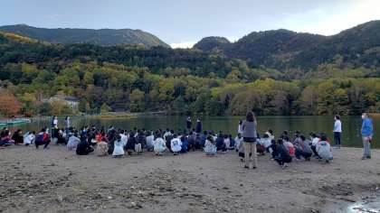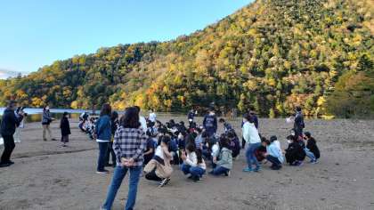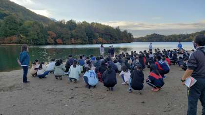3日目の朝。湯ノ湖畔で朝会を行いました。天気も良さそうです。