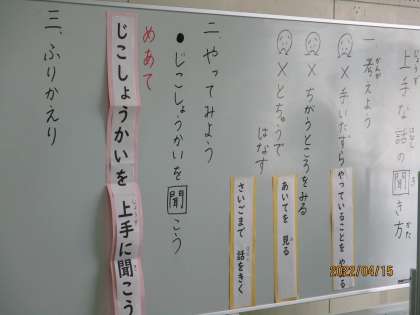 小集団で「上手な話の聞き方」を学びました。構造化(視覚的にわかりやすくする工夫)で学びやすい授業です。