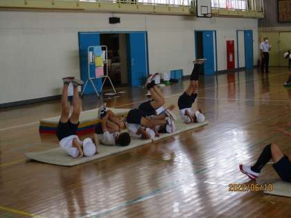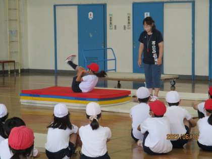 子供たちが楽しみながら自然とマット運動の基礎技能や基礎感覚(腕支持や逆さ感覚、回転の感覚等)が身に付く運動から始まり、子供たちは、倒立、回転のコツを互いに教え合いながら挑戦しました。
