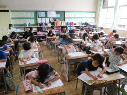 2年2組では、漢字をマスターするために集中しています。時間をめいっぱい学習に使っています。