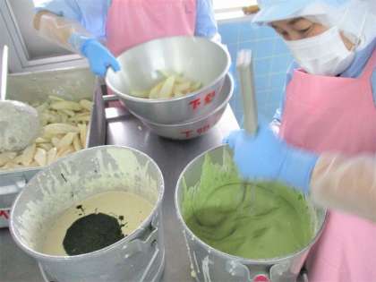 「今日は9(く)月8(わ)日の語ろあわせから桑の葉を使った桑都揚げをつくりました。桑の葉で衣を色づけし、ささかまぼこを油であげます。」