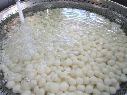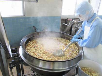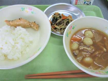 「明日は十五夜です。給食では秋の収穫に感謝の気持ちを込めて十五夜献立を作りました。上新粉と白玉粉でこねたお団子は調理員さんがひとつひとつ小さく丸め、削り節でとったダシのお汁に入れてお月見団子汁を作りました。」