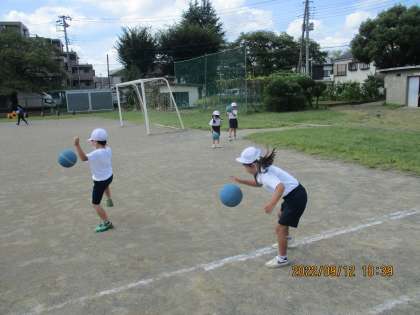 ボールをつく、とる、体の動きに合わせてつく運動をしました。