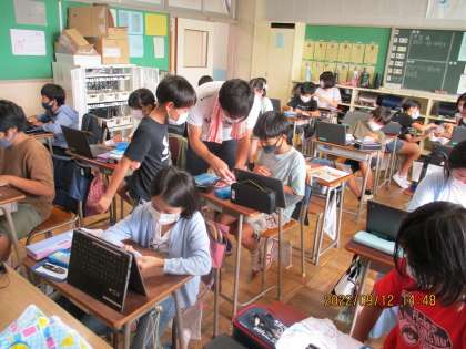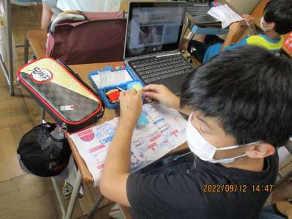 デジタル教材を活用して、裁縫の実習に取り組んでいました。
