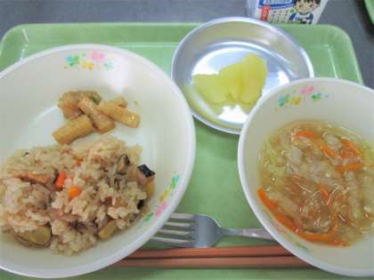 「今日は九州から取り寄せた栗を使い、吹き寄せおこわを作りました。もち米を一緒に炊いたのでもちもちした食感にあまい栗がよくあいます。栗にはビタミンや食物繊維も多く含まれています。」