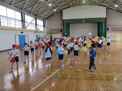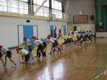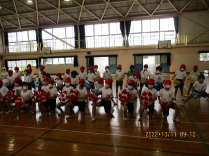 3年生も体育館で動きの確認をしたのち、本番を演じる校庭で練習をします。