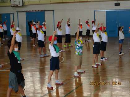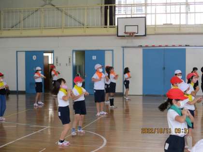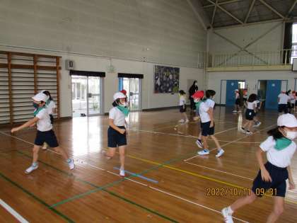 2年生も今週最初の表現の動きを体育館で確認し、校庭にとびたします!