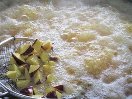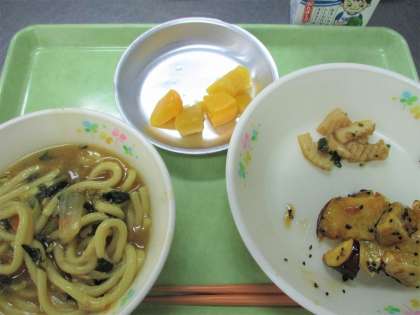 「旬の野菜であるさつまいもを使った献立です。子供たちも大好きな大学芋です。第十小学校では、60kgあるさつまいもを調理員さんたちが小さく切ってくれます。さつまいもは、ビタミンや食物繊維が豊富で風邪の予防が期待できます。運動会まであと少し、あたたかいうどんを一緒に食べて体調をととのえましょう。」