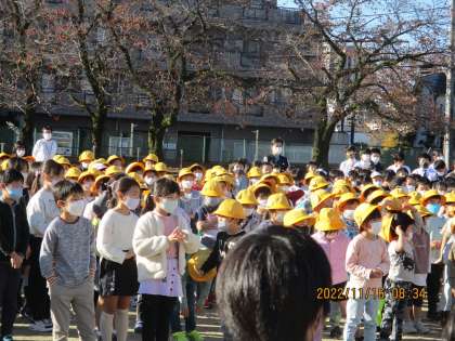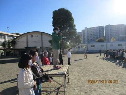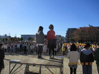 校庭で2回めの集会は、「先生○×クイズ」です。