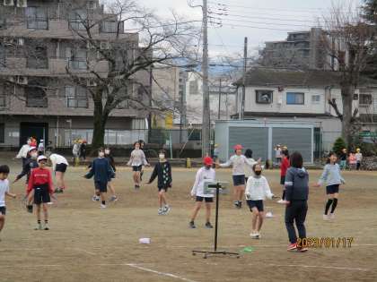 校庭ではなわとびでウオームアップをして、次に走運動ゲームを行いました。