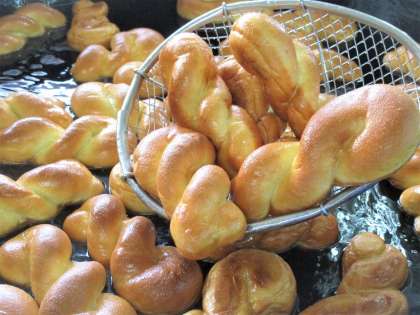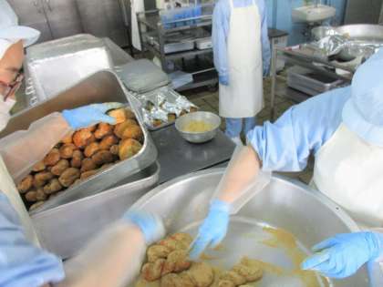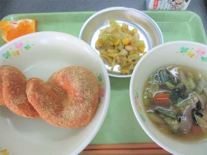 「今日は、みんなが大好きな揚げパンです。揚げパンが給食に登場したのは今から約50年前、高温の油でさっと揚げたパンにきなこや砂糖をまぶして食べる揚げパンは当時の子供たちからもとても人気がありました。」