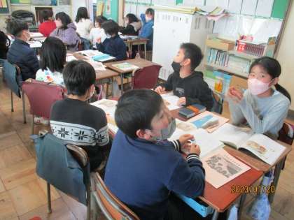 小集団で考えを交流しながら登場人物の心情や気持ちの変化を考えていきます。