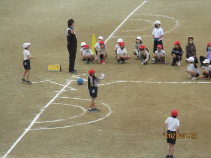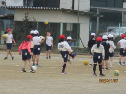 今日の校庭は一段と寒いのですが、準備運動でたくさん動いて体をあたため、サッカー型の活動をがんばっています。