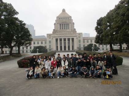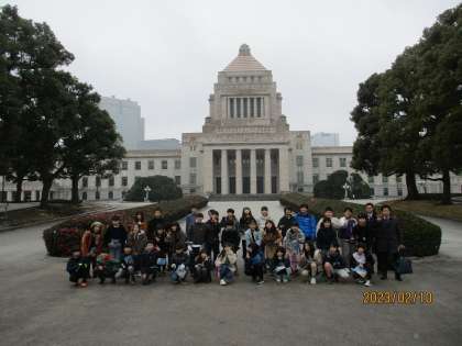 議事堂前でクラス集合写真を撮影しました。運よく、雪が小降りになりました。