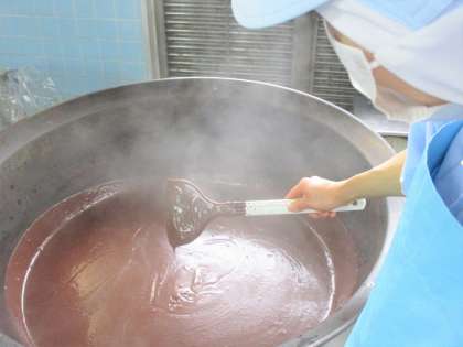 「今日は給食室から心を込めて、バレンタイン献立です。ココアクリームを給食で作りました。ココアと砂糖を牛乳で練って、温めた牛乳でのばしていきます。コーンスターチを加えてとろみをつけます。」