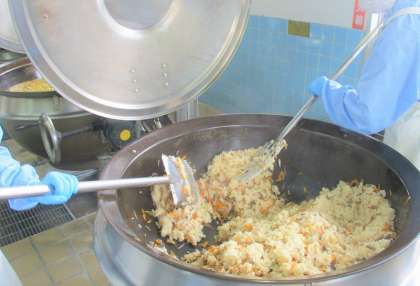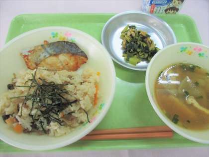 「今日の給食は和み献立で大阪府の郷土料理です。『かやくごはん』の『かやく』は漢字で『加薬』と書き、『料理の薬味、具』という意味です。他のおかずがなくてもさみしくなく、短い時間でおいしく食べられる『かやくごはん』は商人の街として栄えてきた大阪で忙しく働く人々を支えてきました。『炊いたん』とは関西地方の方言で『煮物』のことをいいます。ゆっくり加熱して、だしを食材に含ませる料理です。『ごんぼ汁』は『ごんぼ(ごぼう)』と『卯の花(おから)』を入れることが特徴のすまし汁です。