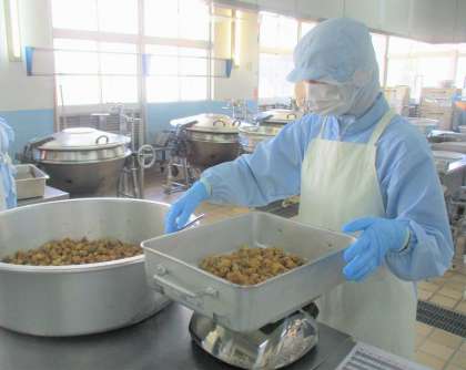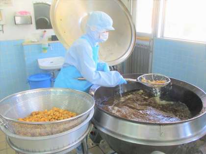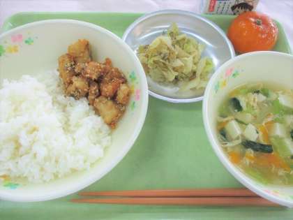 「今日の給食は五つ星献立です。主食、主菜、副菜(汁物)、果物、乳製品の五つがそろっています。色々な食品をバランスよく食べて元気に過ごしてくださいね。」