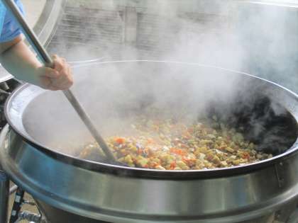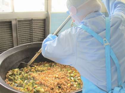 「やきとり丼はねぎと鶏肉をオーブンで焼いて、焼き色をつけてから回転釜で混ぜて味をつけました。