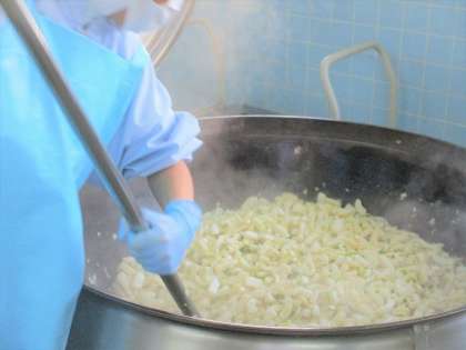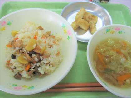 「今日の給食の吹き寄せおこわには栗が入っています。栗は塩と砂糖でゆで、油揚げ、しいたけ、たけのこ、鶏肉などの具はしょうゆで味つけし、混ぜ合わせて作りました。栗には、肌をきれいにするビタミンやおなかの調子を整える食物繊維が多く含まれています。秋の味覚を味わって食べましょう。」