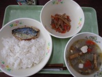🌸今日の献立🌸・あずきごはん・さばの塩焼き・かきたま汁・浅漬け・牛乳~八王子産の...