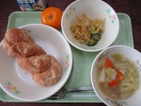 🌸今日の献立🌸・きなこ揚げパン・野菜のスープ煮・パリパリアーモンドサラダ・果物(...