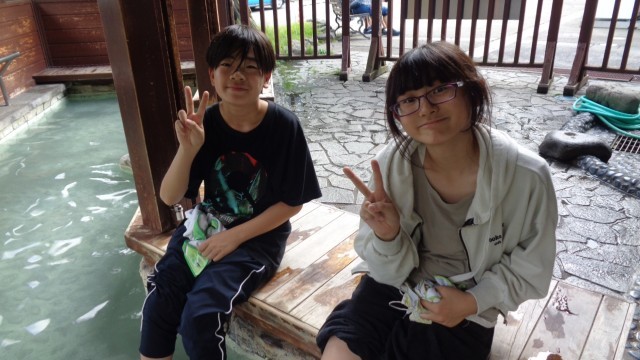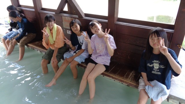 源泉、足湯、温泉神社を、クラスごと、順繰りに回りました。