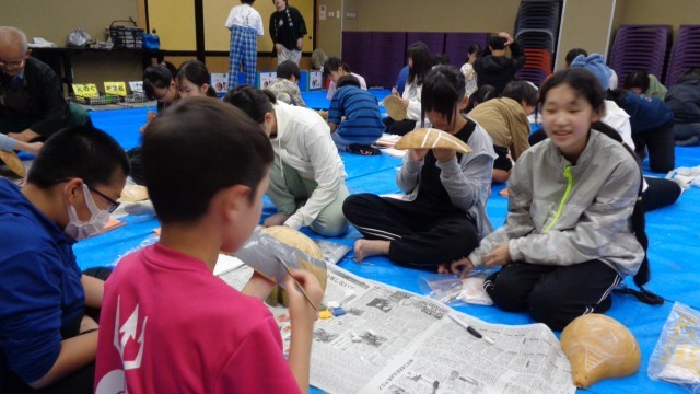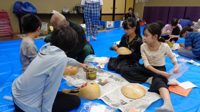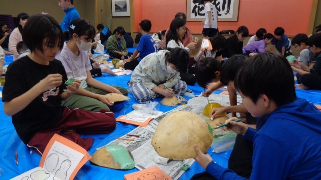 まずは各自の瓢箪に絵を付けていきます。下絵を描いてきたので筆がスムーズに進んでいました。