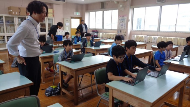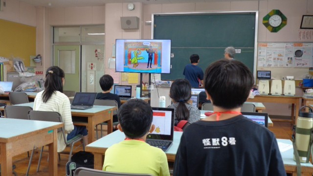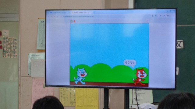 本校は、指導員として大勢の先生方がお手伝いをしてくれています。この日は2人の先生が参加してくれました。写真は子どもたちが作ったスクラッチの作品です。
