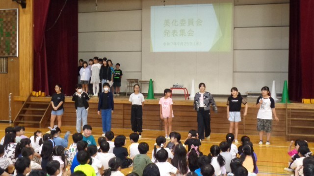 25日(木)、美化委員会の発表集会が行われました。進行役はいつものように元気いっぱい集会委員会の子たちがしてくれました。