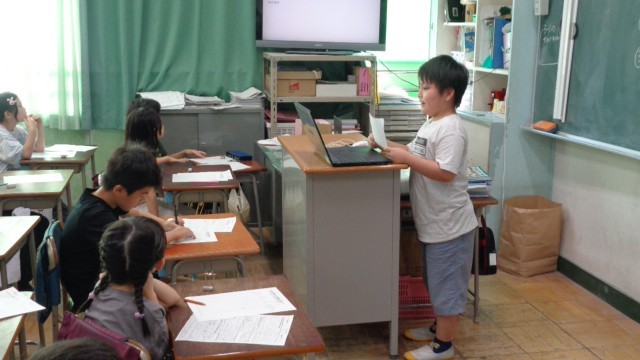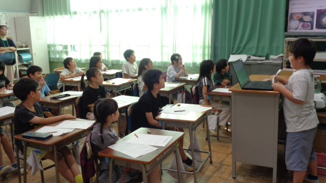 3年1組です。総合で自由研究の発表会をしていました。どの子もタブレットを使っての発表でした。