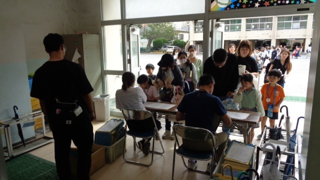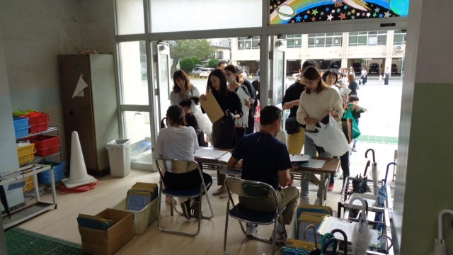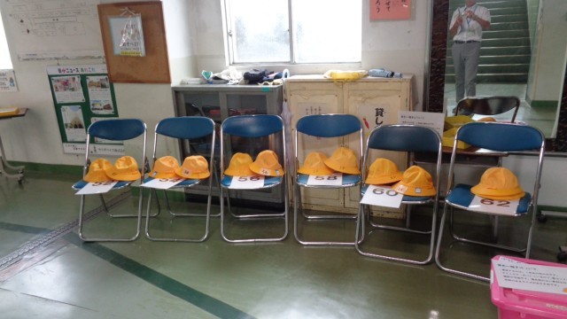 大勢の子どもたちが健康診断を受けました。名簿上の入学予定者数は92名です。黄色い帽子もサイズを確かめてもらうために用意してあります。