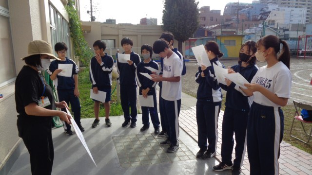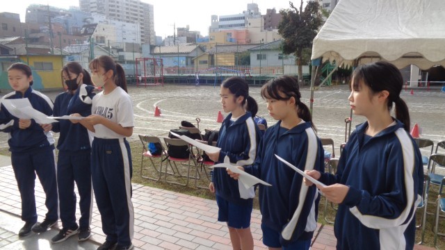 絶好の天気の中、10月18日(土)、運動会が実施されました。今年も第五中学校の生徒さんが12名、ボランティアとしてお手伝いに来てくれました。ありがとうございます。係について、担当の先生からレクチャーを受けています。