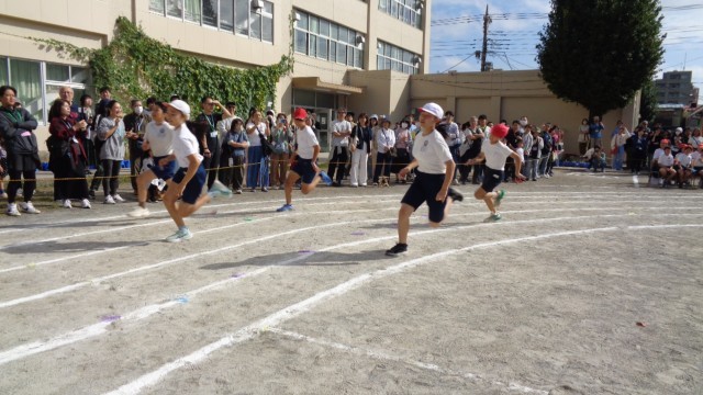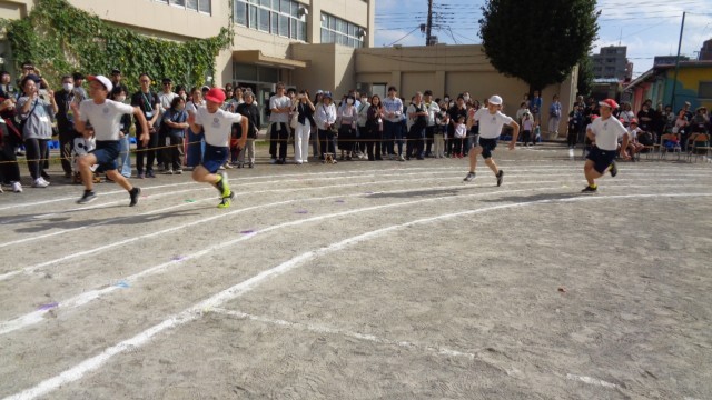 6年生90m走です。力強い走りに感心しました。他学年からも大きな声援が飛んでいましたね。