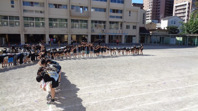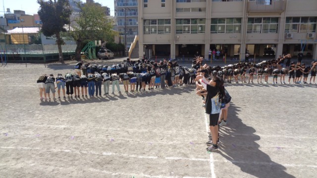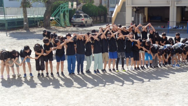 前半はマスゲームのように全員でいろいろな技に取り組んでいます。きれいな波が完成しました。