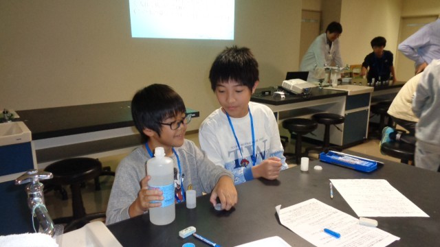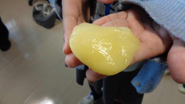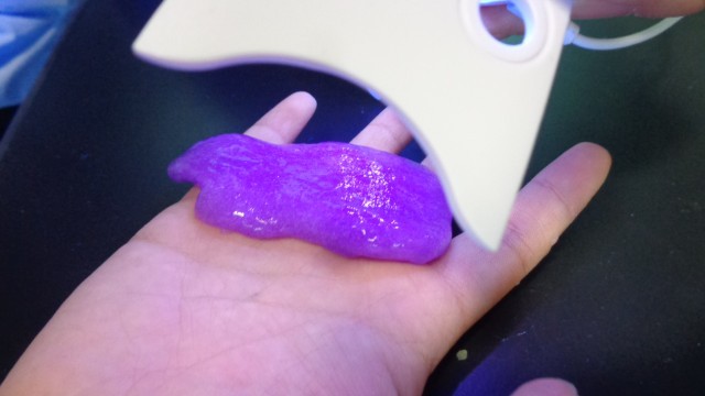 同じ講座では、紫外線にあてると変色するスライム実験をしました。子どもたちは何色になるかドキドキしながら紫外線装置にスライムを当てていました。