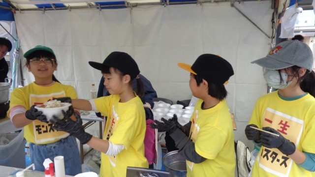 全部で23チームが出場していました。会場に来て食した方たちの投票の結果、一位のチームのメニューが学校給食のメニューになります。4人も一位を目指して頑張っていました。