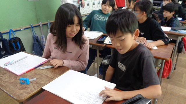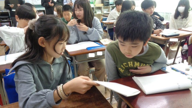 子どもたちがそれぞれの考えを隣の友達と意見交換しながら共有しています。たくさんの意見が出されていました。