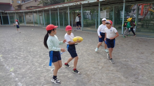 校庭から元気な声がするので行ってみると、4年生(1組・3組)が体育の学習中でした。