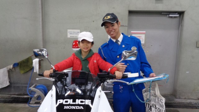 庁舎の地下は大きな駐車場になっていて、たくさんの白バイとパトカーなど、警察関係車両がありました。白バイ隊員の方と記念撮影です。
