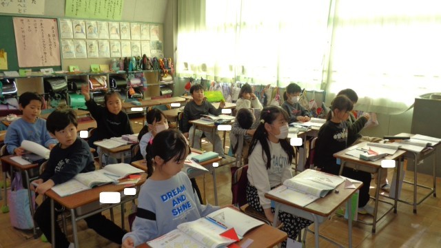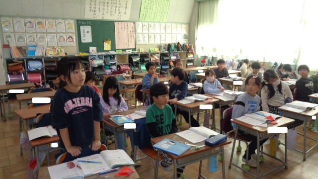 2年2組です。2年生は4グループに分かれ、算数の学習をしていました。