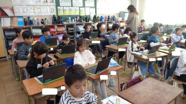 2年1組です。1組もタブレットを使って直角三角形の学習をしていました。