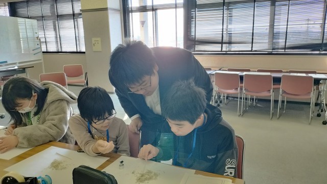 こちらはちりめんモンスター講座です。ちりめんじゃこに混じっている様々な水生生物を探しています。子どもたちは夢中になっていました。