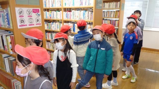3階の小説などがある書架を見学しています。お父さんお母さんが読む本が多い階です。