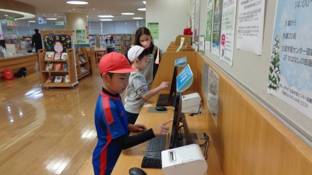 検索機を使って、お目当ての本を探しています。司書の先生がサポートしてくれました。