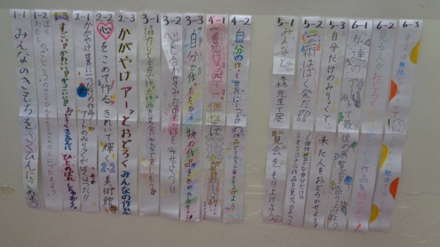 明日から土曜日まで展覧会です。平日は児童鑑賞日になっていますが、夕方1時間はご覧いただけます。体育館への階段には、展覧会の全体テーマと、各クラスのスローガンが貼られています。